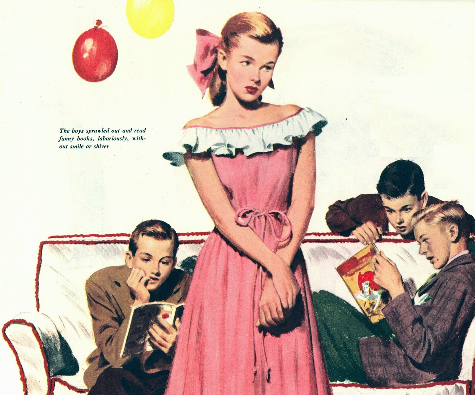 After the social crises of the Great Depression and WWII, during which the normal cycles of mating were suspended due to economics and war, the definition of femininity settled back down a bit, as a generation of pent-up social desire to reproduce was manifested in the great Post War economic boom. The strength, determination, and endurance implicit in femininity was replaced with a much more light-hearted and romantic ideal. American women had put off their reproductive futures for four years or longer, thanks to the war, and for them a defining characteristic of femininity, outside of marriage, was motherhood.