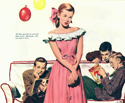 But this Depression and War-time femininity also expresses a deep longing for better times . . . not as factory workers or secretaries, but as wives of well-employed husbands. Rosie the Riveter might have wanted to sling steel to beat the Jerries and the Japs, but she wasn't doing it out of a sense of feminine empowerment, she was doing it to further her long-term reproductive goals. As soon as the War was over, she planned on getting married and having an ass-load of kids, because that was her reward for sacrificing her best reproductive years for the good of her nation. A heroic husband with a good job and ass-load of kids. Your grandparents.